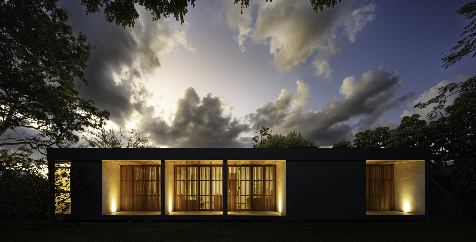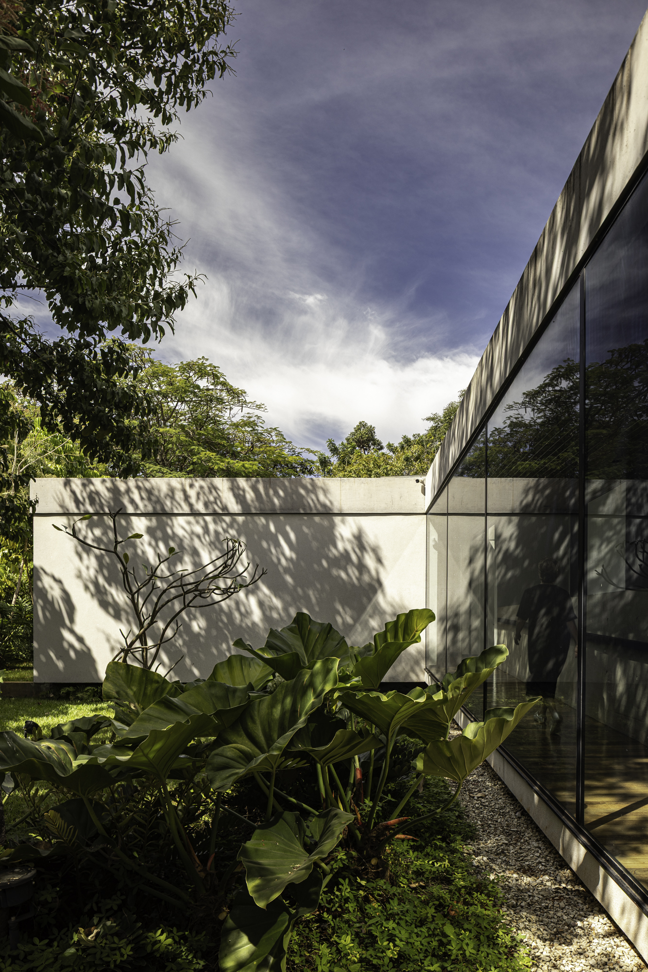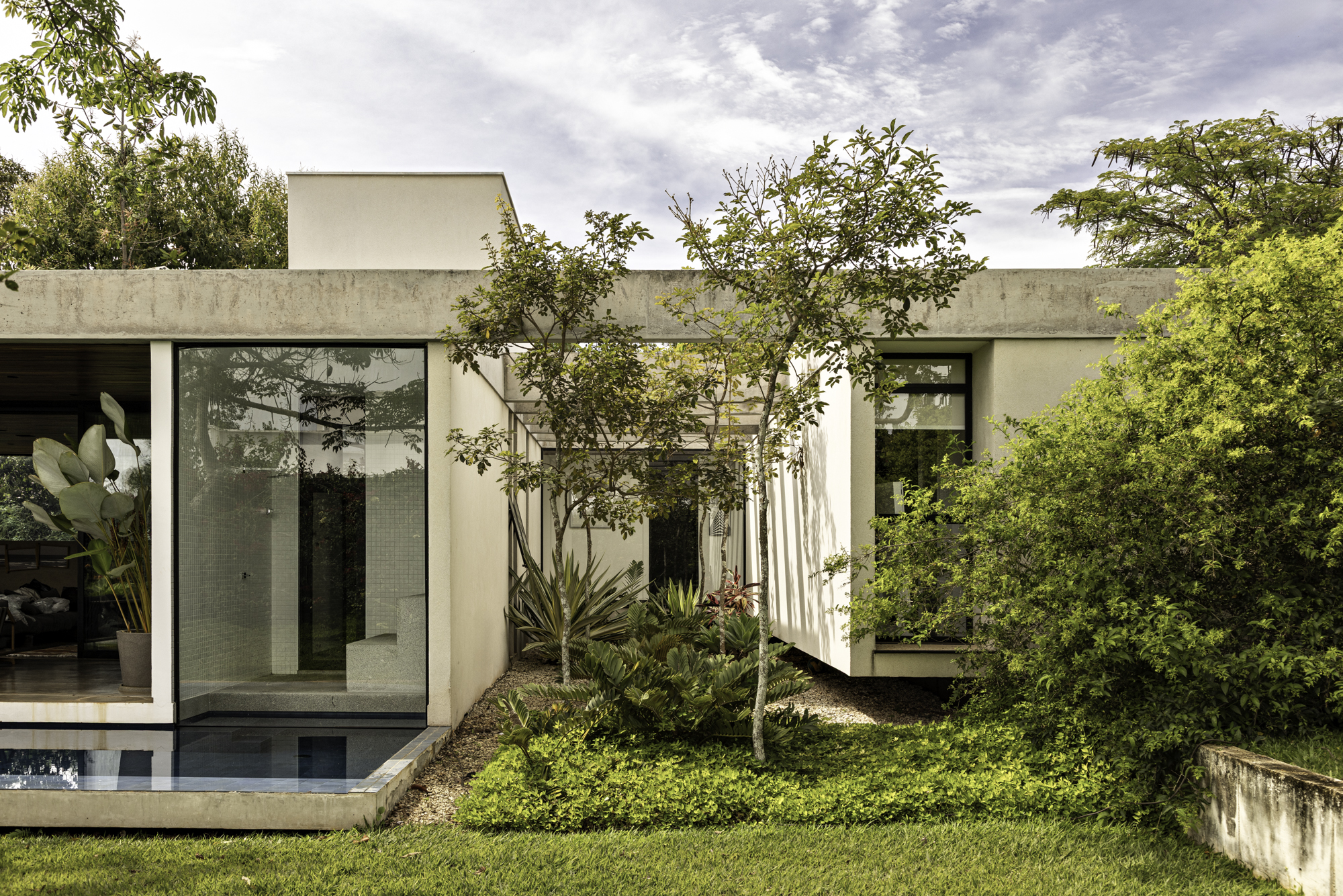A residência se acomoda na porção central do terreno e permite que todos os ambientes principais se abram para o jardim. Com um único pavimento e leves desníveis que acompanham a topografia natural, a casa conta com ventilação cruzada e conexão com a natureza externa.