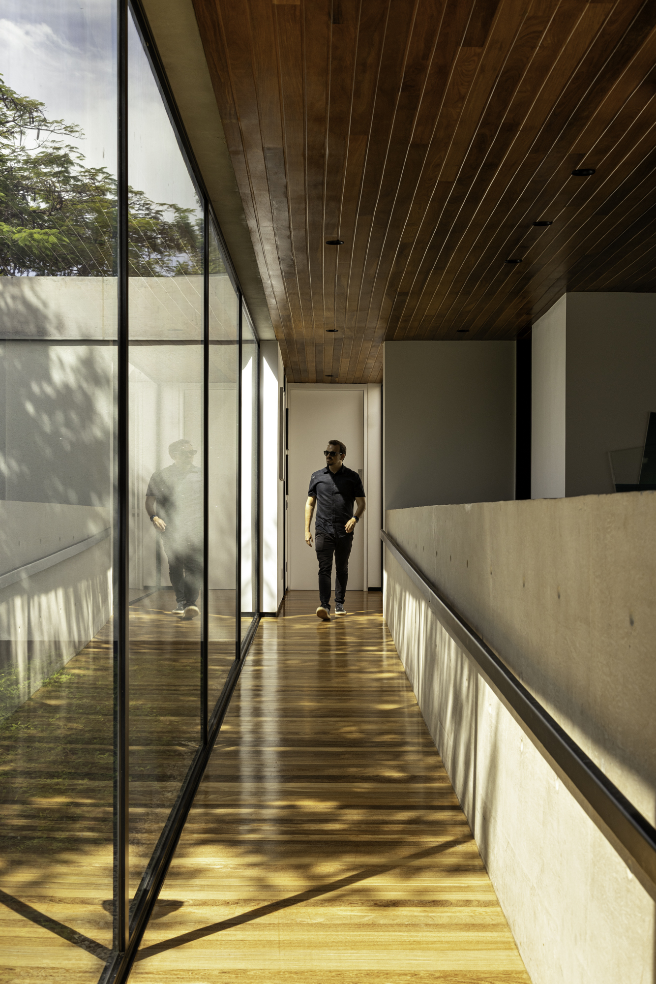A ampla varanda coberta, que dá nome à residência, é considerada o coração do projeto. A área se conecta à piscina, deck, sauna e jardim. A transição dos blocos, ligados pela varanda, é feita por uma grande viga de concreto aparente que organiza visualmente a edificação.
