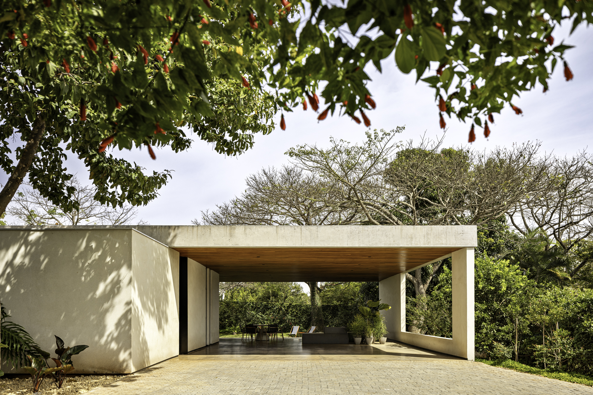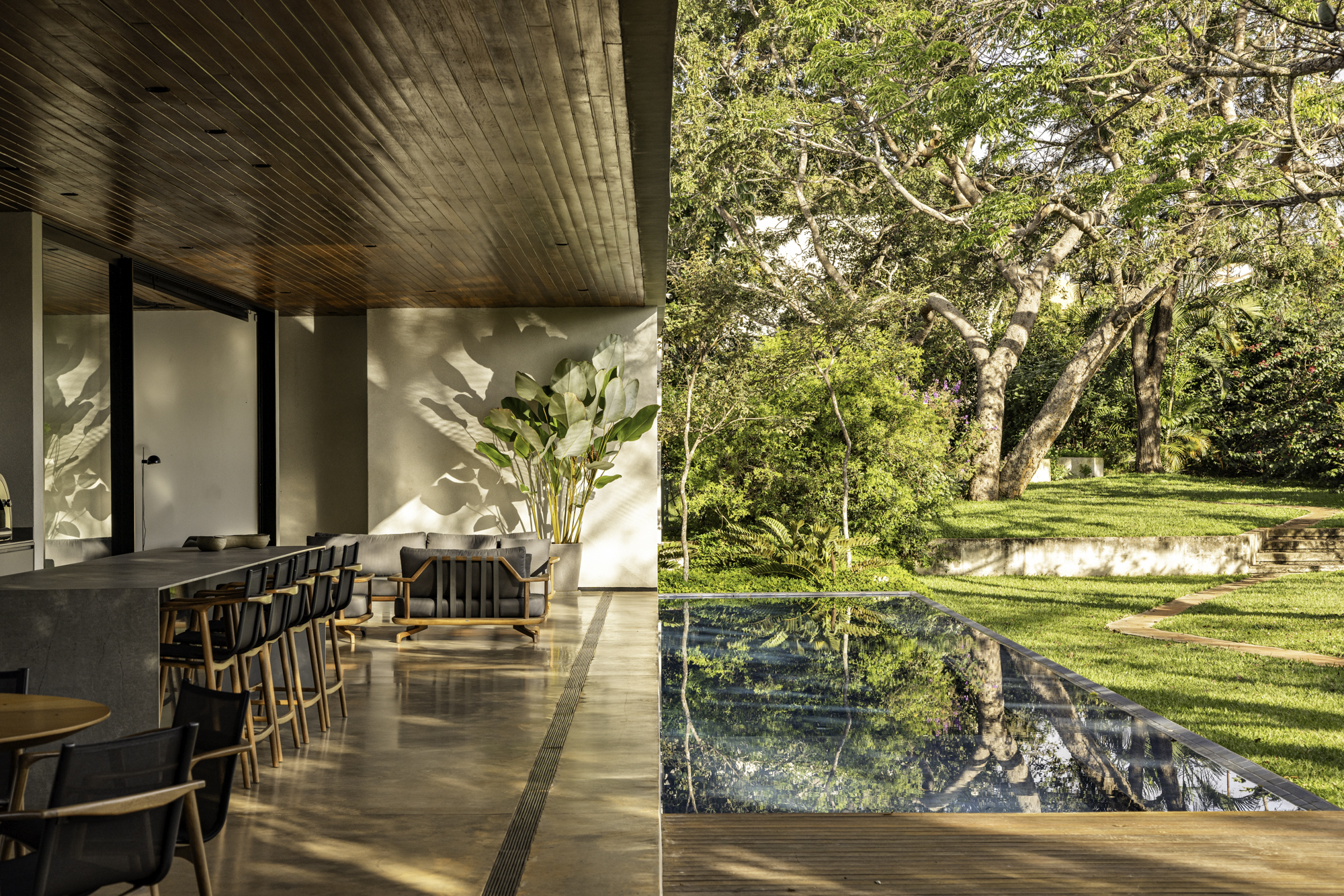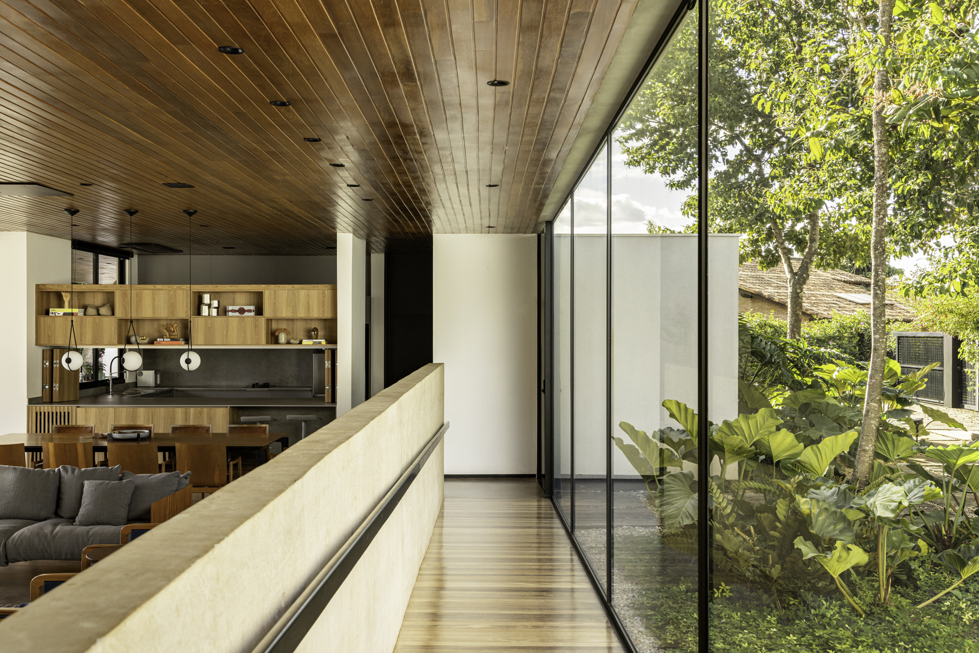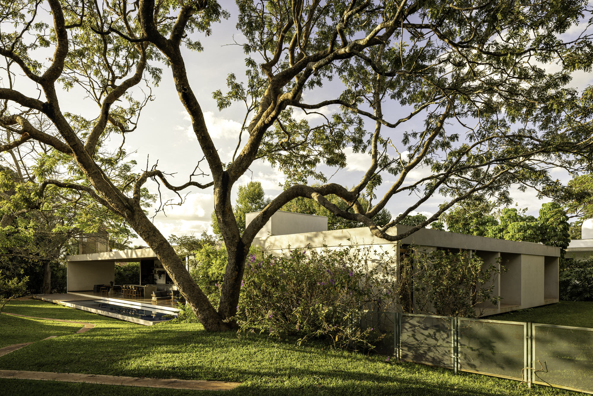 O paisagismo vai além da estética, ele contribui para o microclima da residência e reforça a imersão na natureza. As paineiras merecem um destaque especial. As floradas e painas da espécie marcam as estações. Esse ciclo natural traz aos moradores a chance de perceber o tempo através da paisagem.