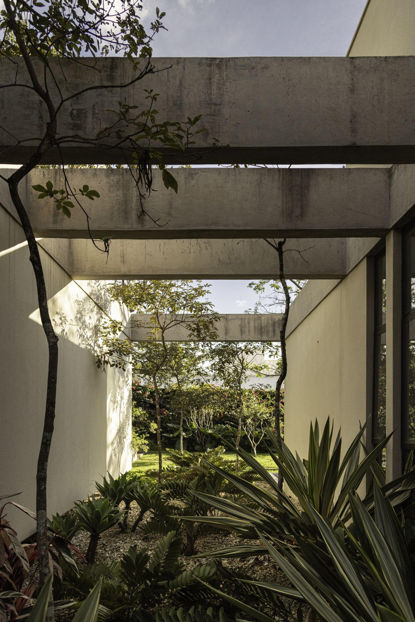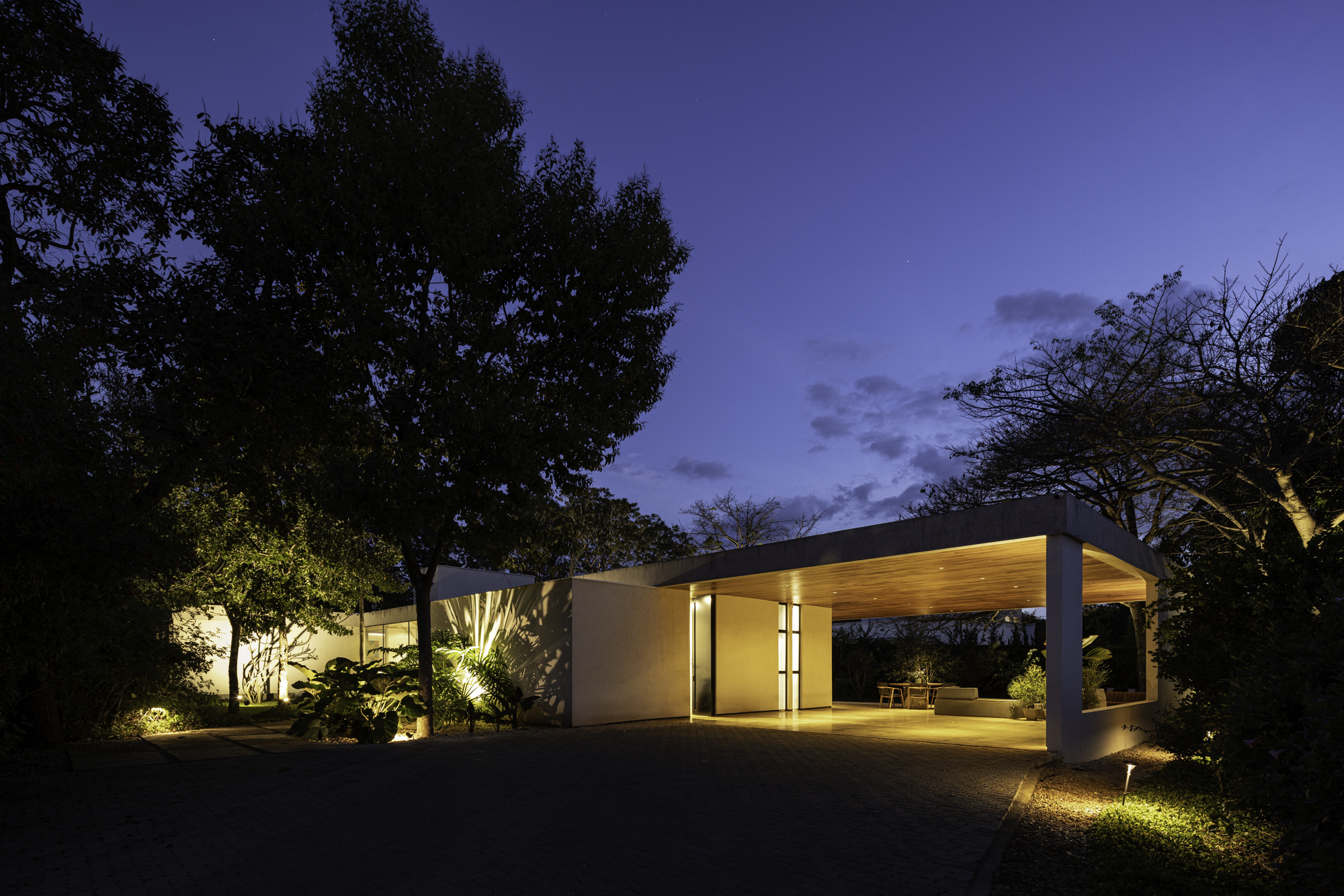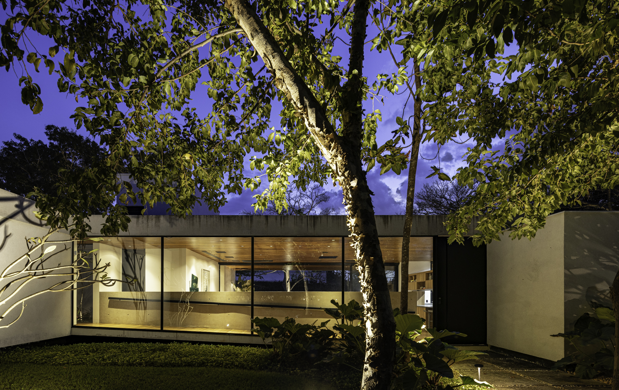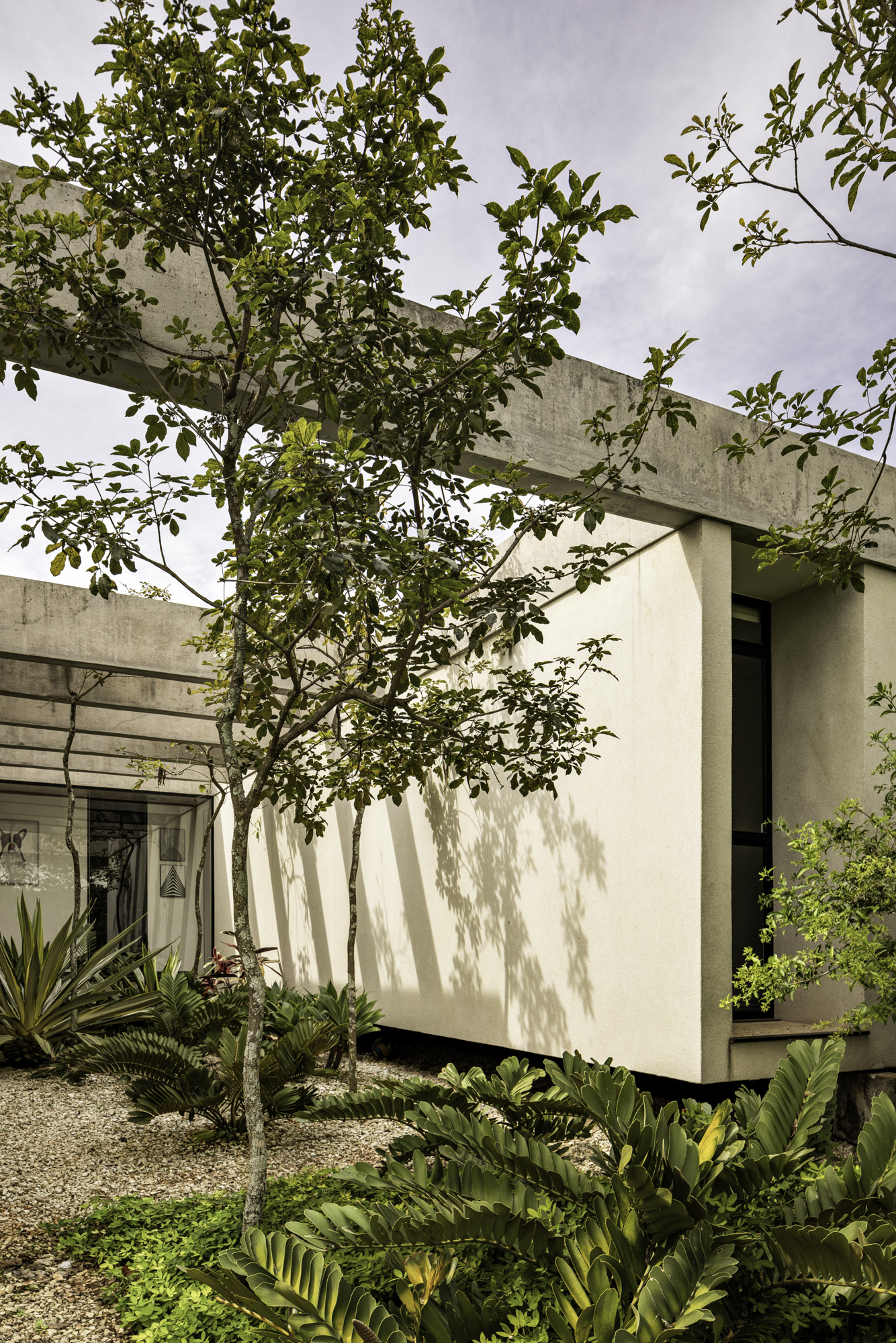 O paisagismo vai além da estética, ele contribui para o microclima da residência e reforça a imersão na natureza. As paineiras merecem um destaque especial. As floradas e painas da espécie marcam as estações. Esse ciclo natural traz aos moradores a chance de perceber o tempo através da paisagem.