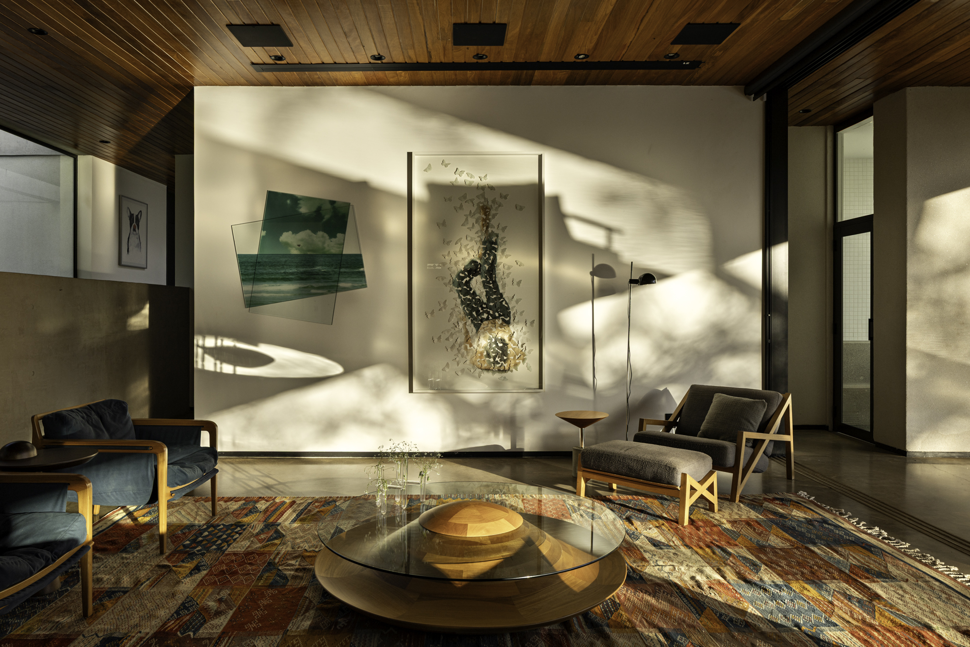 A materialidade foi pensada para reforçar a integração entre arquitetura e natureza. O concreto aparente das vigas superiores e no piso da área social, estrutura e unifica os volumes. As paredes brancas neutras e leves garantem a luminosidade ideal para dar vida à galeria doméstica. Já a madeira, presente no forro da área social e no piso do bloco íntimo agregam textura e conforto.